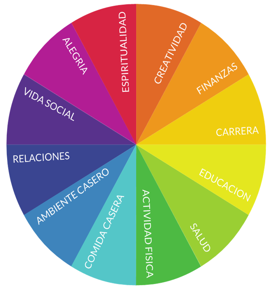 A continuación se muestra un círculo de la vida básico. Puedes modificar los títulos de los segmentos o dividir los segmentos para que se adapten mejor a tu situación de vida personal, pero los principios de funcionamiento básico siguen siendo muy similares: